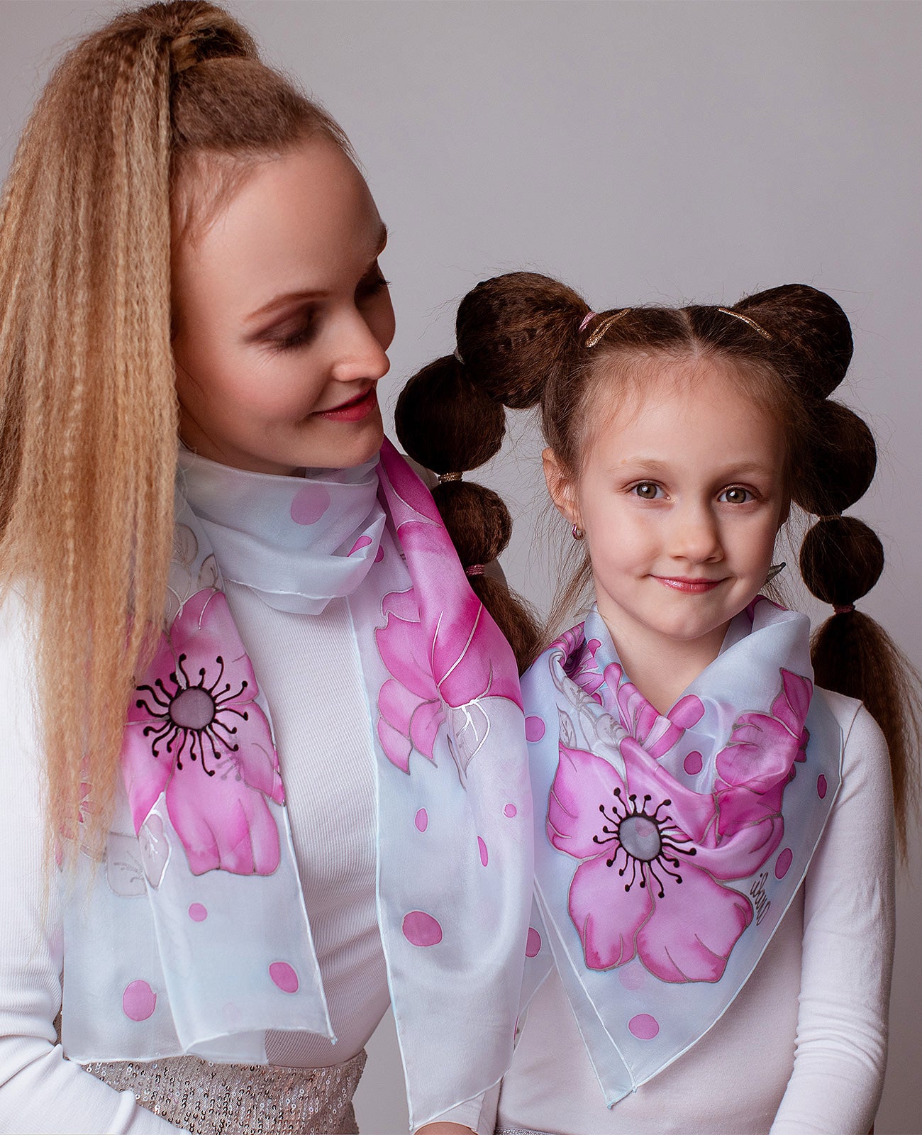 Pink Flowers Hand Painted silk Scarves Set - Mother & Daughter