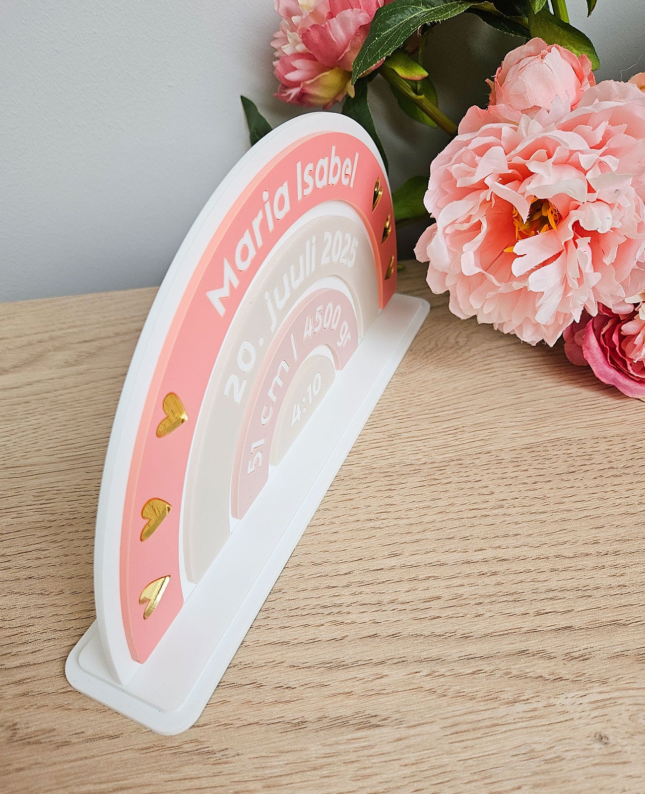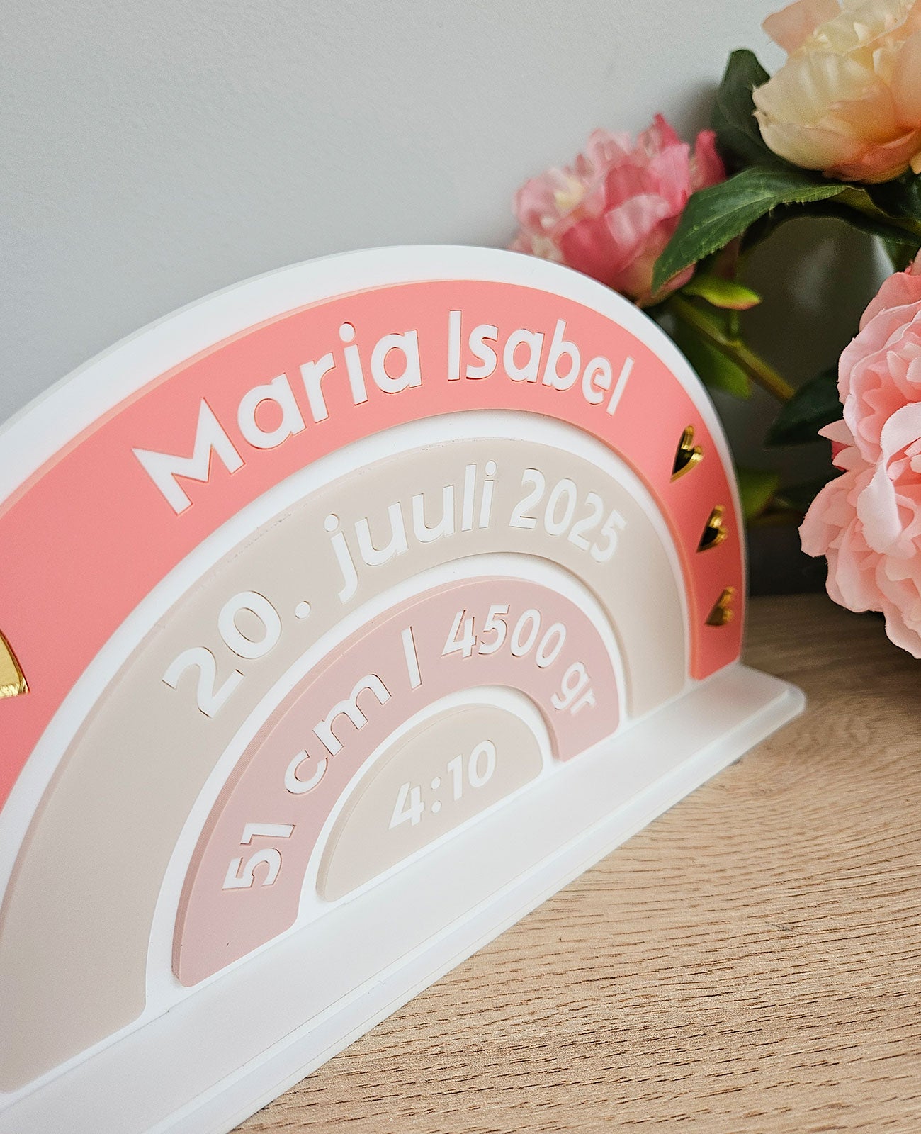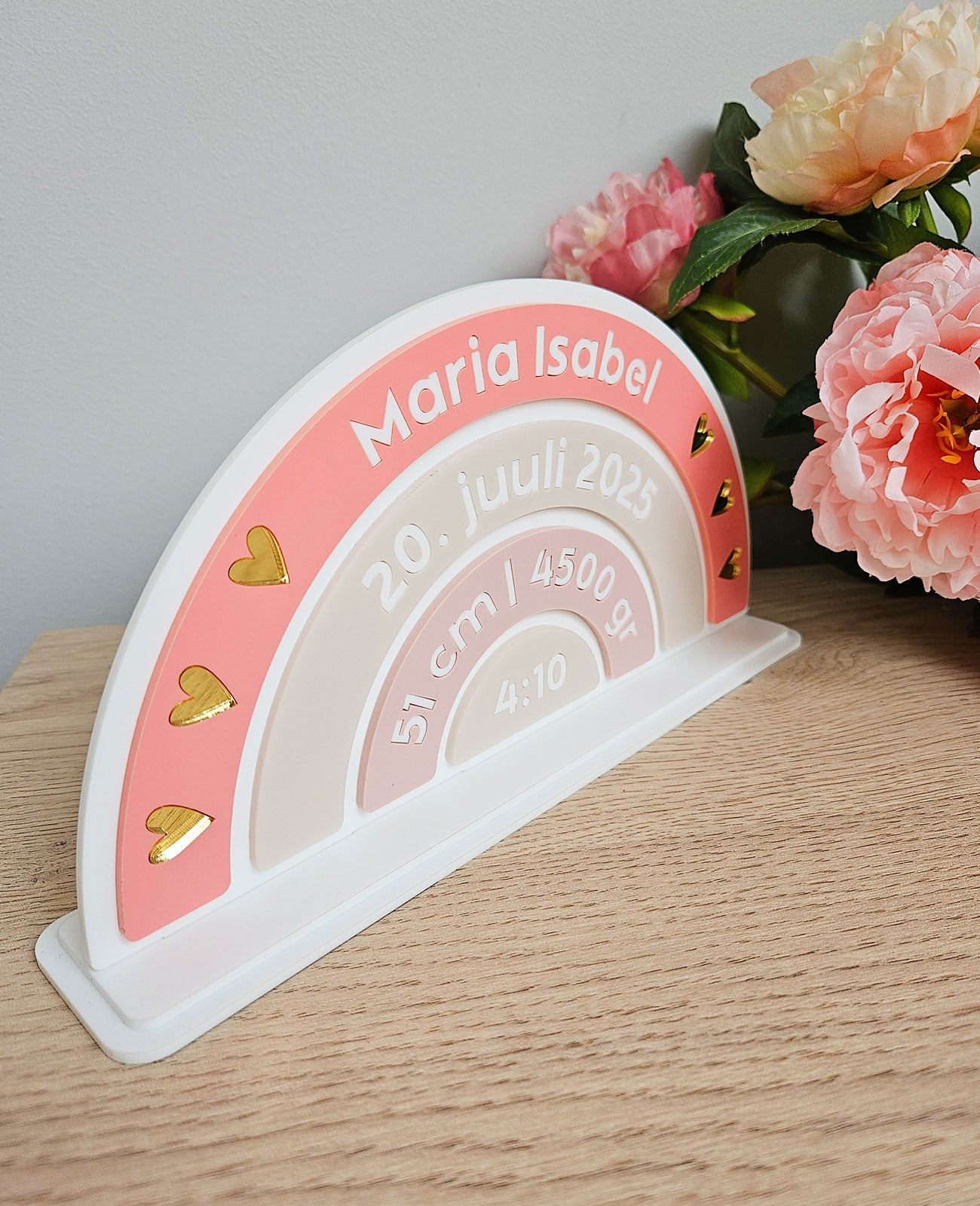 Kingitus lapse sünni puhul tema andmetega, valmistatud akrüülist.