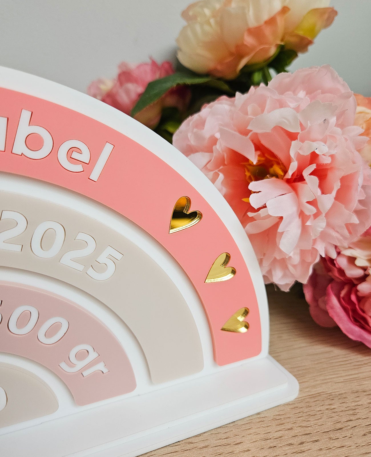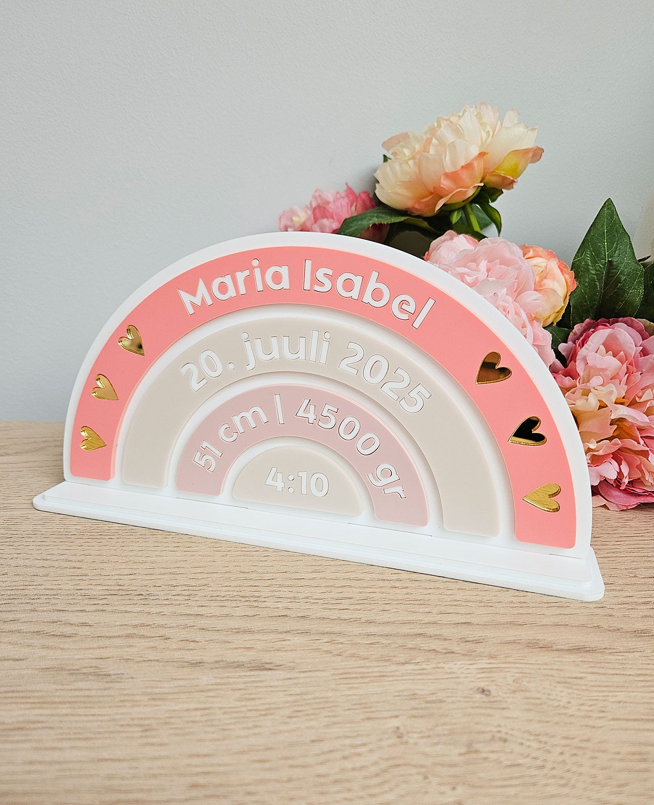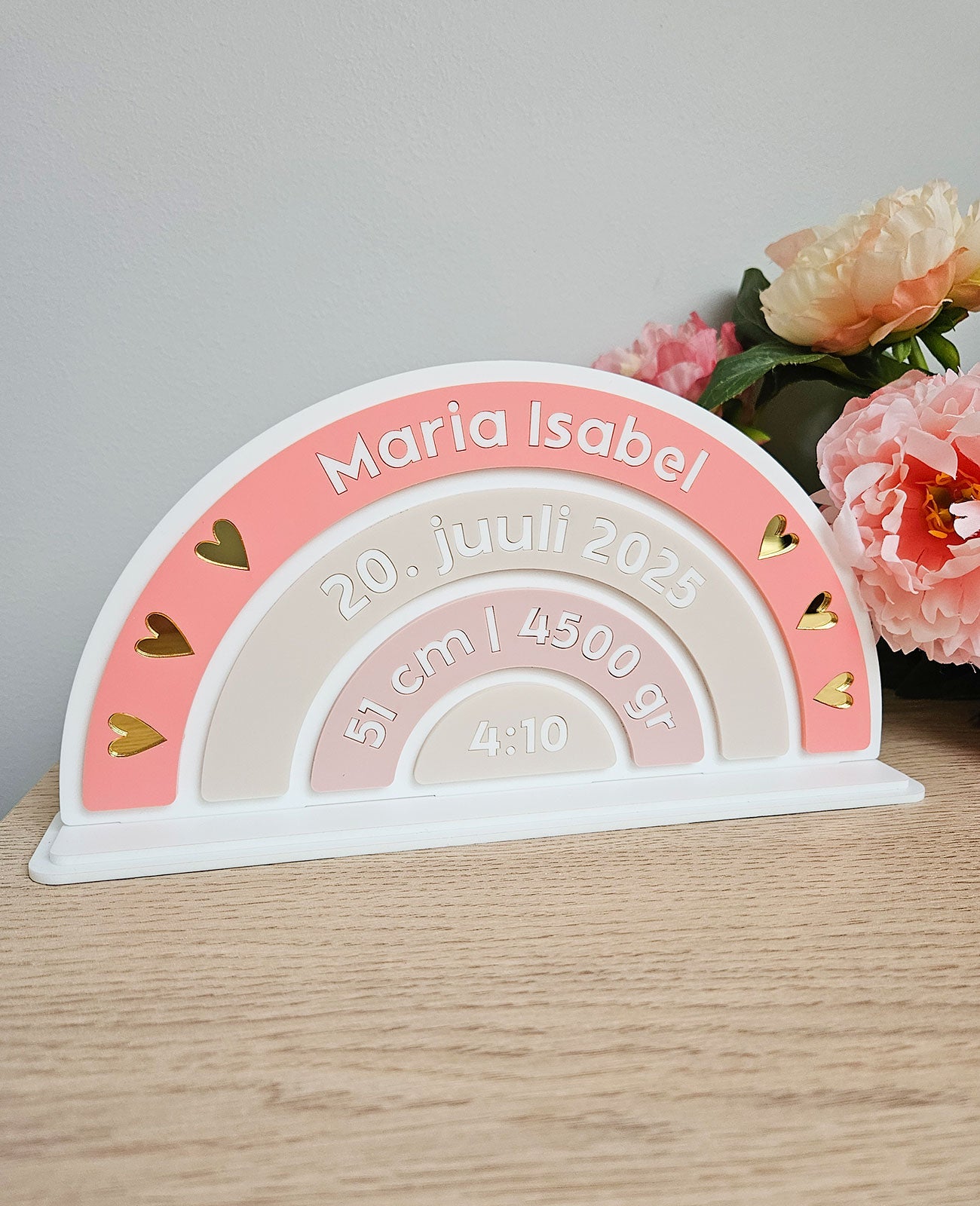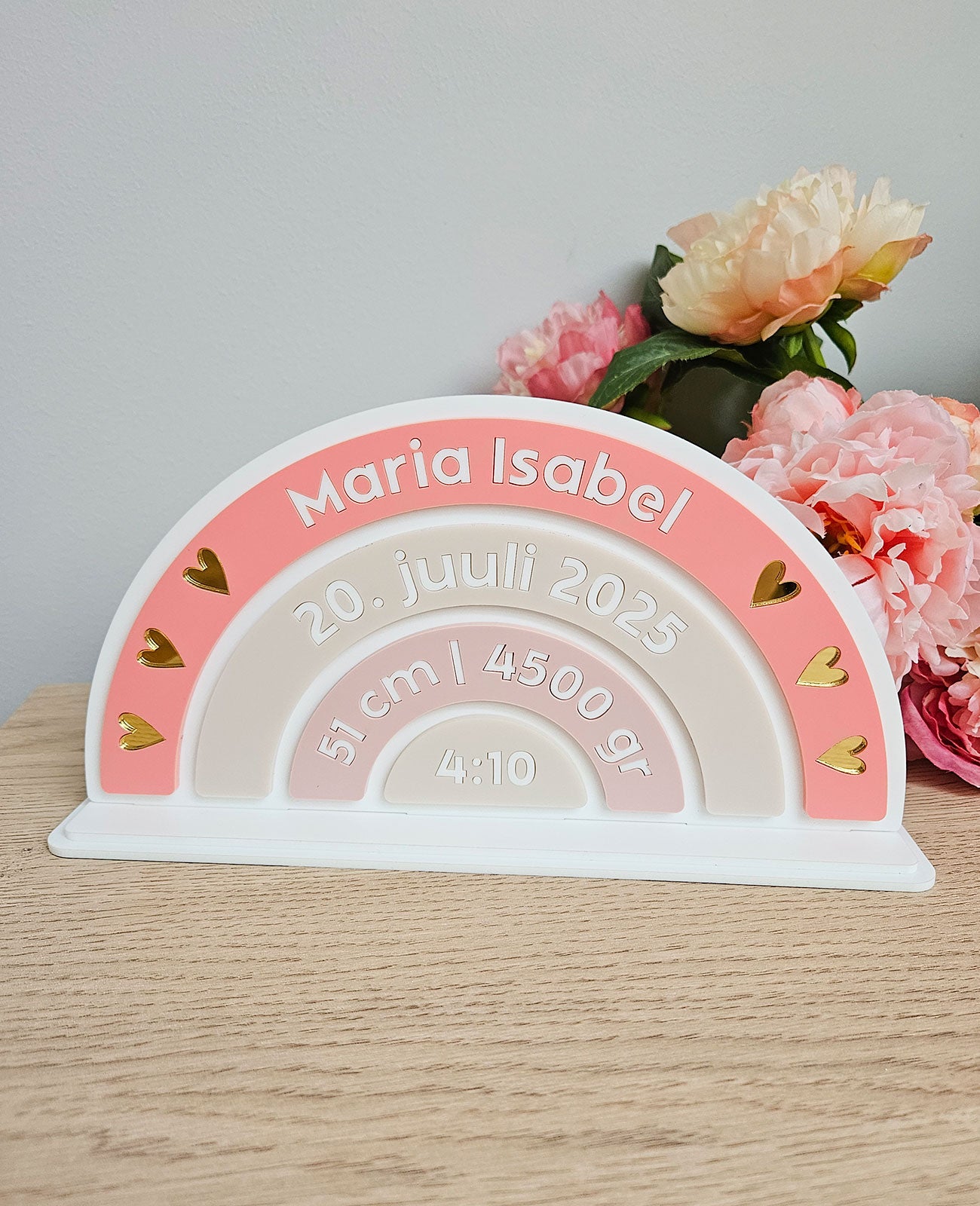 Kingitus lapse sünni puhul tema andmetega, valmistatud akrüülist.